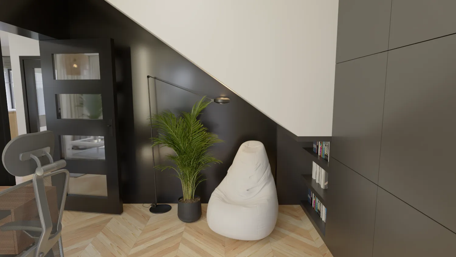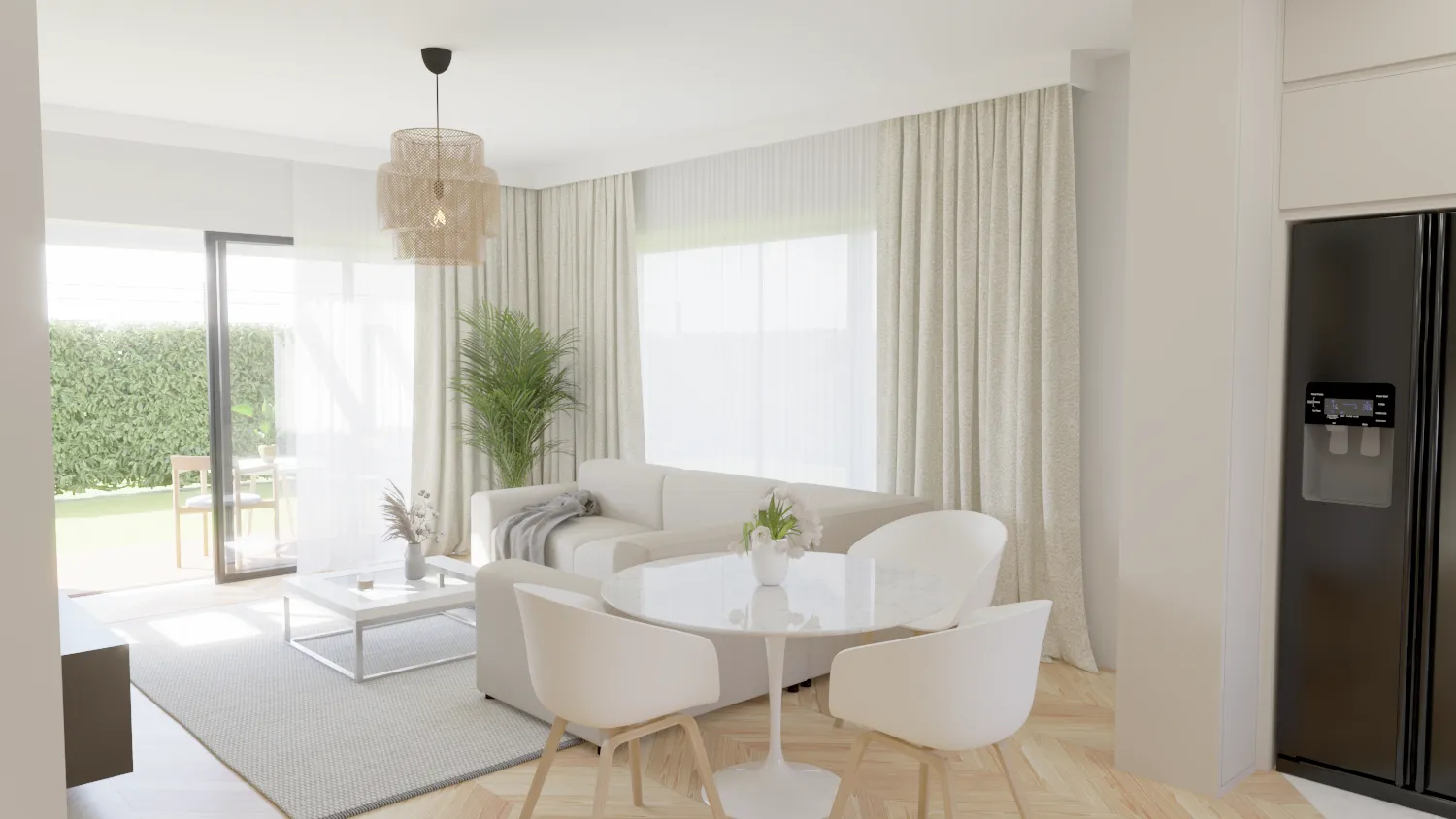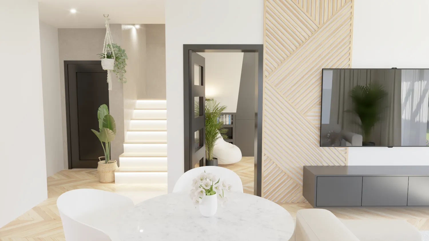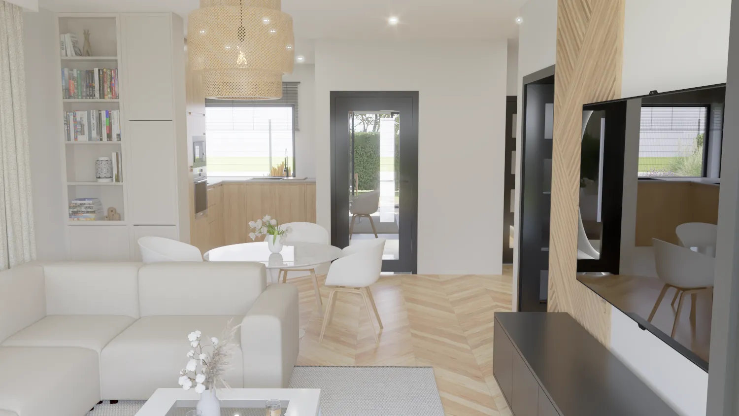 Przestrzeń dzienna – serce każdego domu – została zaprezentowana w sposób maksymalnie realistyczny. Otwarta koncepcja łącząca salon, jadalnię i kuchnię tworzy wrażenie przestronności i komfortu. Wizualizacja ukazuje nowoczesne meble, subtelną kolorystykę i dodatki, które podkreślają elegancję i funkcjonalność.