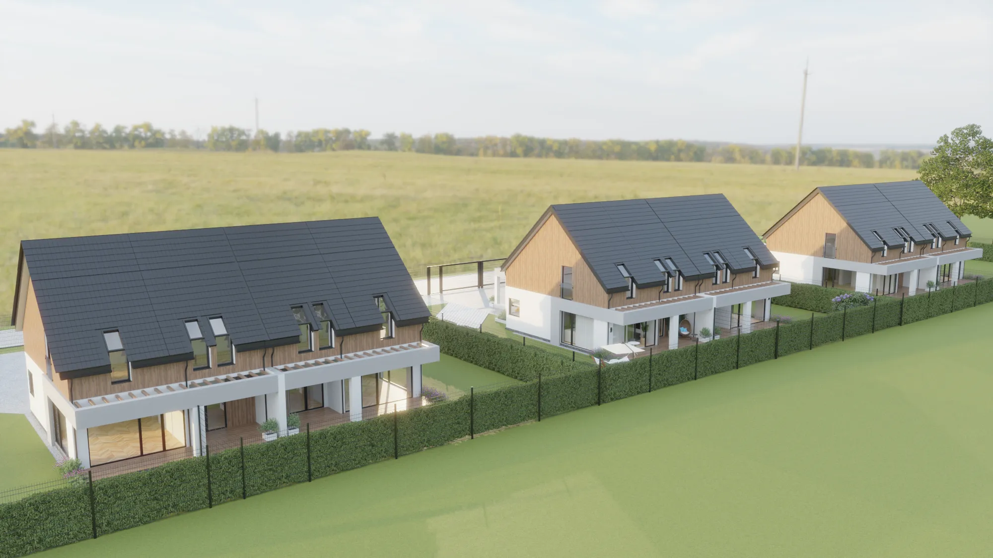 Pierwszym etapem naszej pracy było opracowanie wizualizacji elewacji osiedla. Użyliśmy nowoczesnych narzędzi graficznych, dzięki czemu udało się uzyskać realistyczne odwzorowanie kolorystyki i detali architektonicznych. Elewacje domów wyróżniają się nowoczesnym designem, który idealnie komponuje się z otaczającą przyrodą. Zadbaliśmy o takie elementy jak odpowiednie oświetlenie, układ roślinności wokół budynków oraz realistyczne tekstury materiałów wykończeniowych.