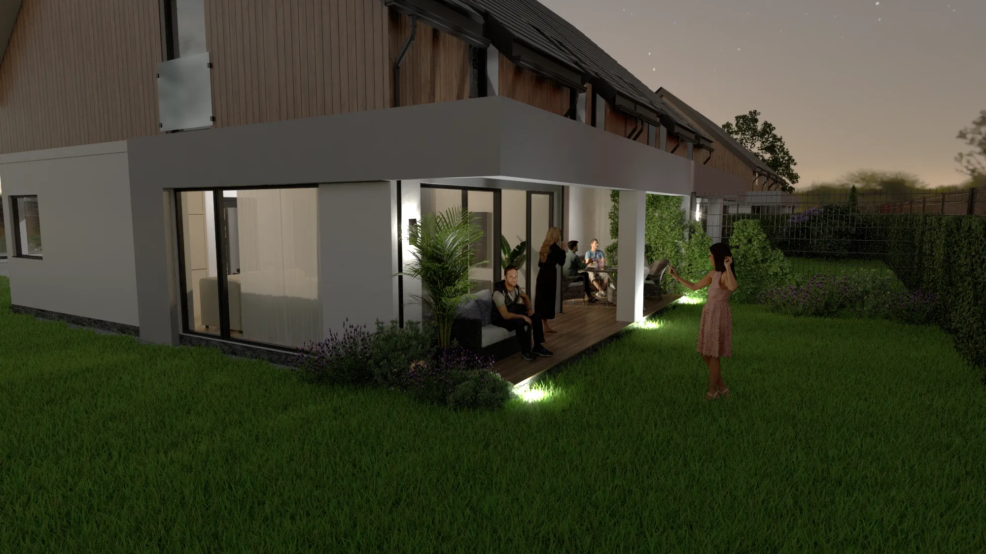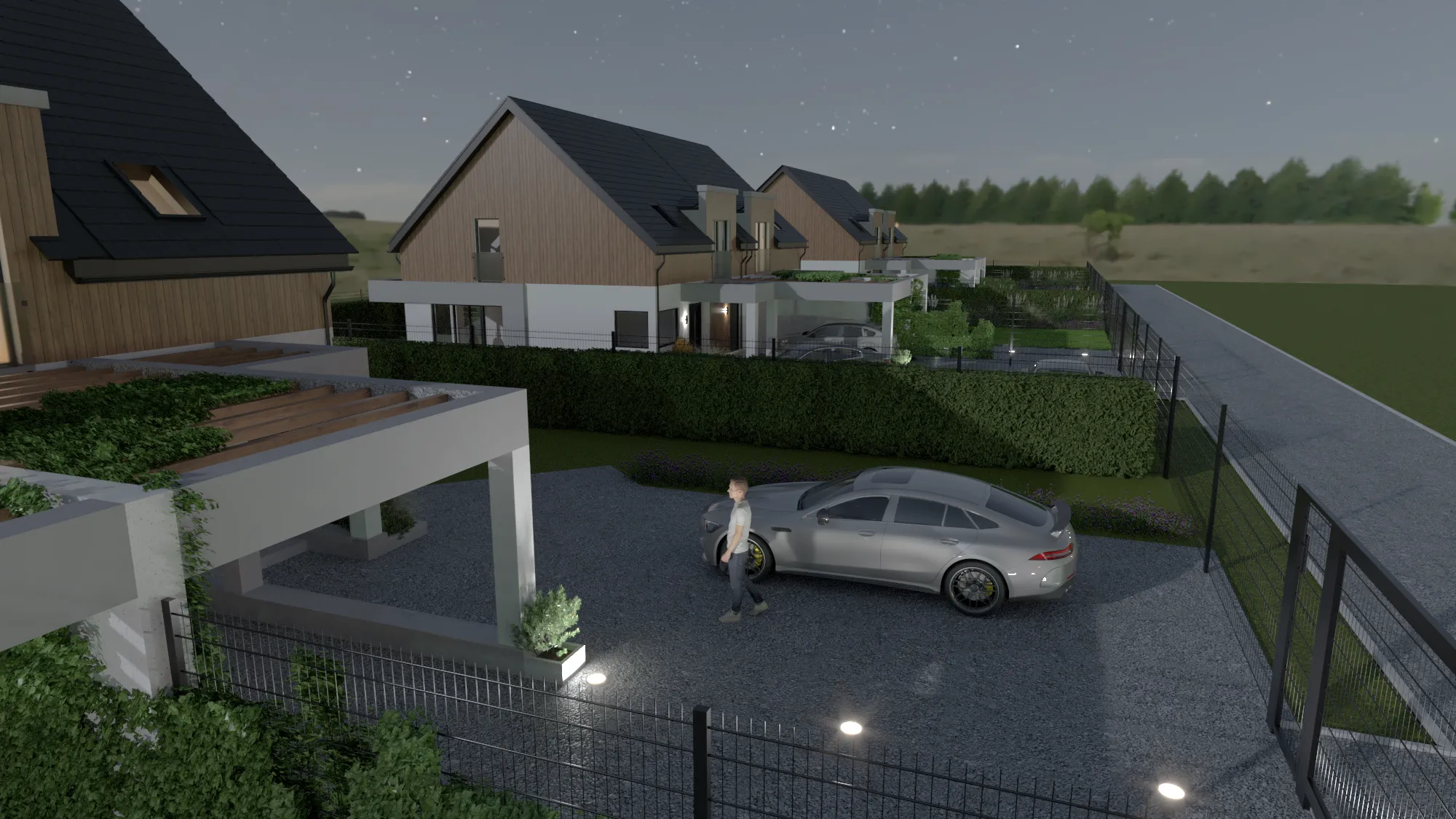 Nasze wizualizacje sprzedażowe nieruchomości nie ograniczają się jedynie do standardowych widoków. Aby jeszcze bardziej przybliżyć klientom atmosferę osiedla, przygotowaliśmy ujęcia zewnętrzne w różnych porach dnia – od poranka po wieczór. Wieczorne wizualizacje, z odpowiednio dobranym oświetleniem, pozwalają wyeksponować detale architektury i podkreślić przytulność domów.